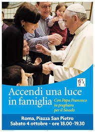 in preghiera per la Famiglia… a Roma o nella propria casa Pubblicato il Ottobre 1, 2015 da suorgloria Domenica 4 ottobre inizia il Sinodo.Sabato sera siamo tutti invitati a pregare insieme a Papa Francesco in allegato il testo della preghiera da fare in Famiglia Preghiera domestica